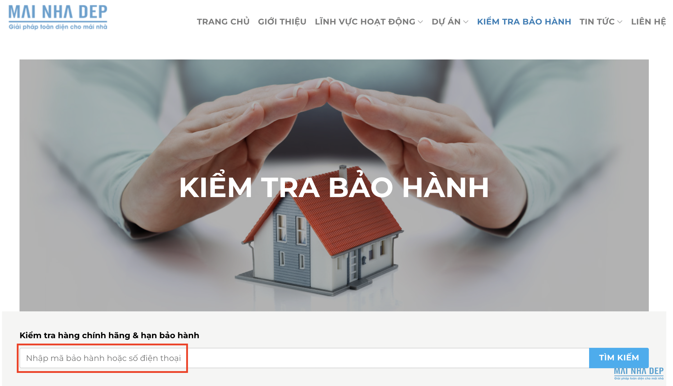 - Truy cập vào trang web chính thức của Mái Nhà Đẹp tại https://mainhadep.com.vn/kiem-tra-bao-hanh/ và nhập mã bảo hành, sau đó nhấn vào tìm kiếm. Mã bảo hành được cung cấp bởi Mái Nhà Đẹp :