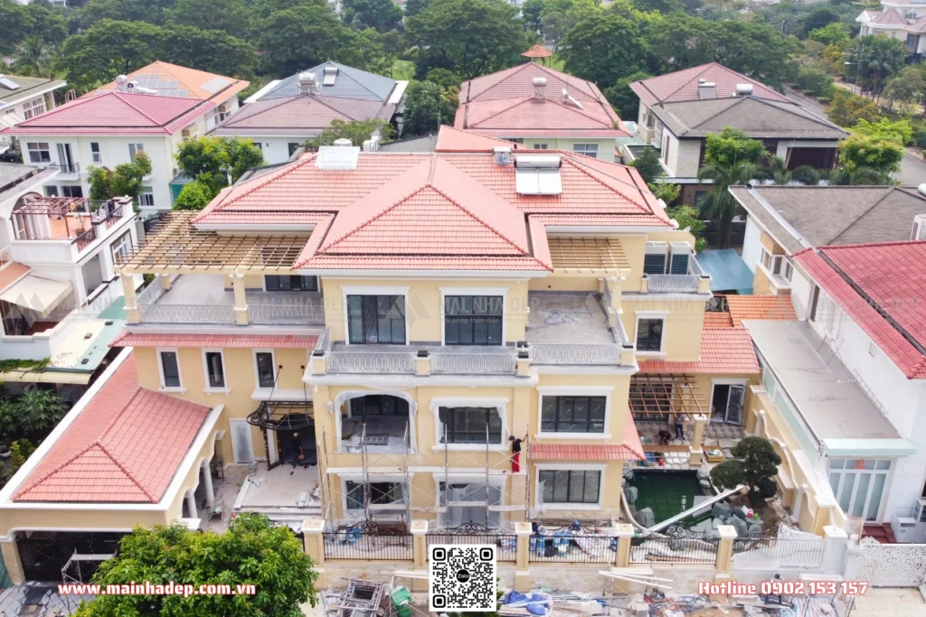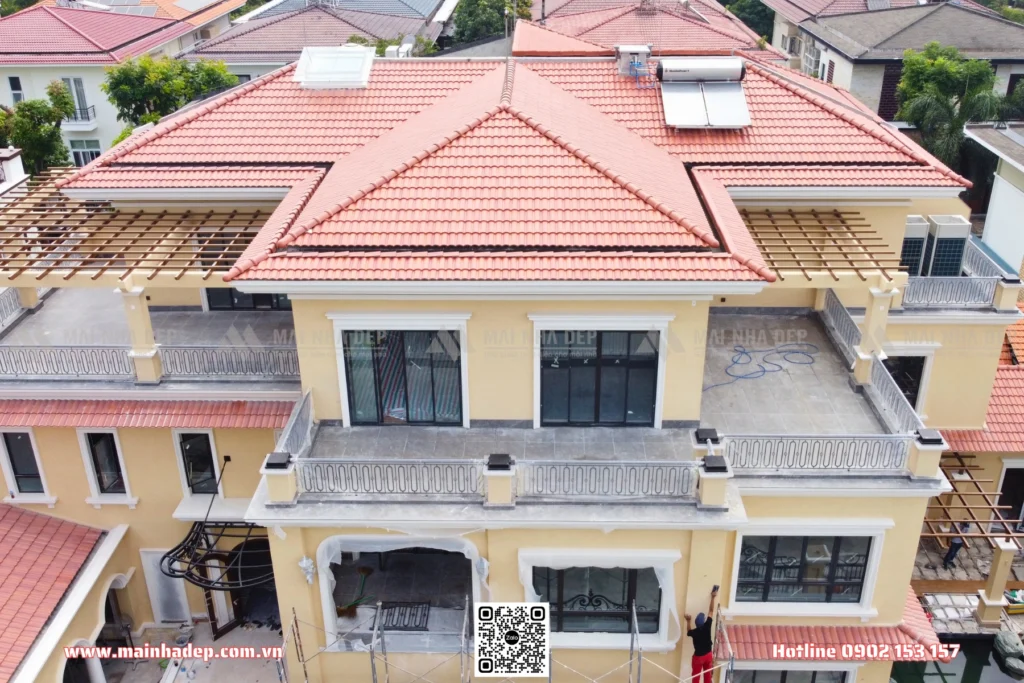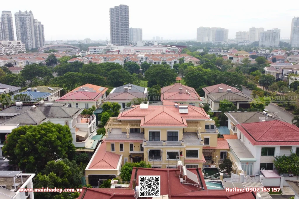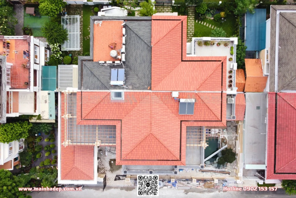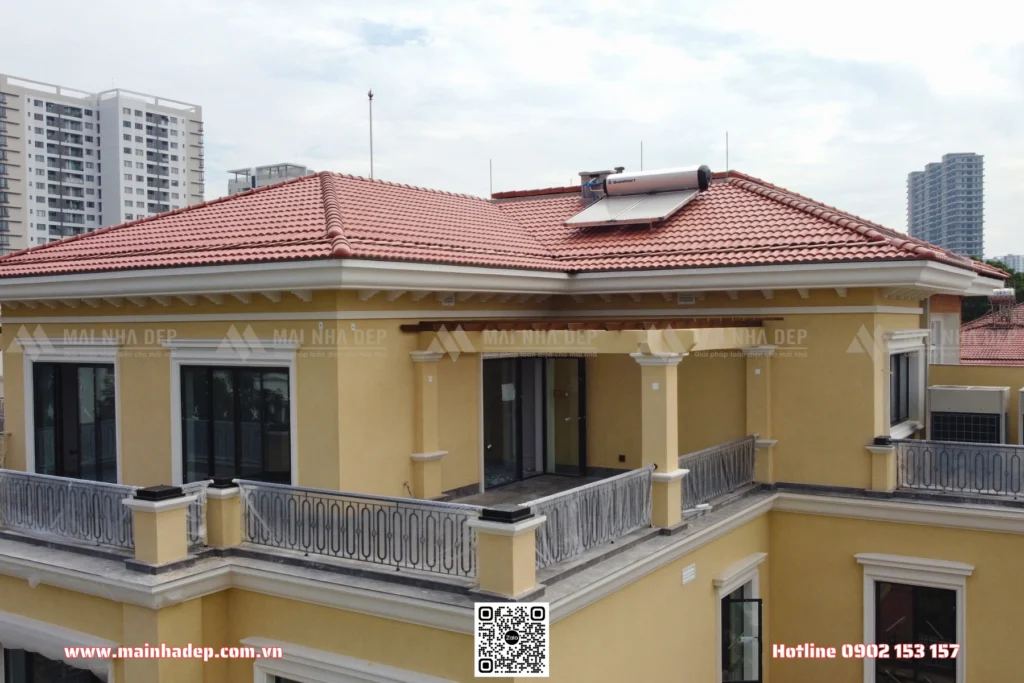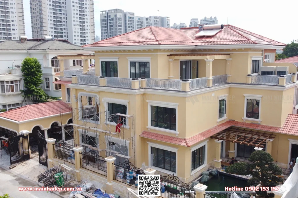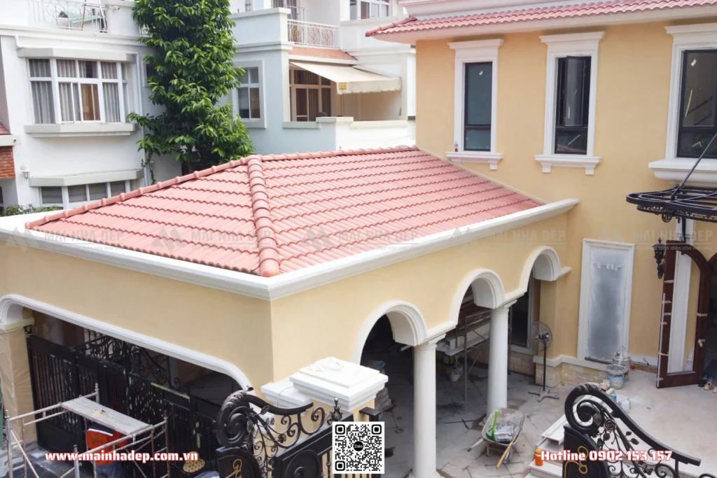 Công trình biệt thự mái ngói The Wall tại Phú Mỹ Hưng, Quận 7, TP. Hồ Chí Minh sử dụng ngói sóng Thái Lan M05, loại 10 viên/m², do Thế Giới Ngói Lợp cung cấp. Hệ mái được thi công bởi đội ngũ Mái Nhà Đẹp, đảm bảo chất lượng, thẩm mỹ và độ bền cao, phù hợp kiến trúc sang trọng và khí hậu Việt Nam.